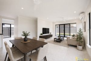 The kitchen is functional and practical with stylish stone benchtops, quality appliances, plenty of storage space with handy butler’s pantry and connects seamlessly with the living, dining area and patio area.
